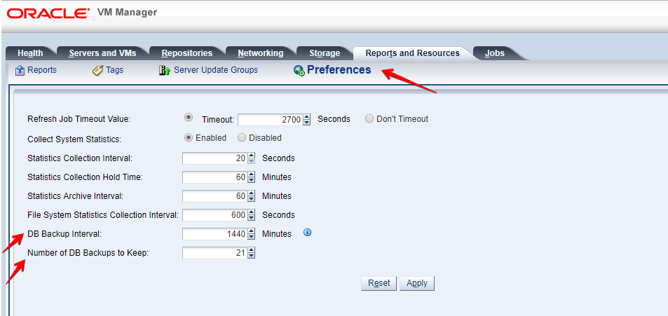 Acesse o Oracle VM Manager e navegue até a aba Reports and Resources > Preferences: