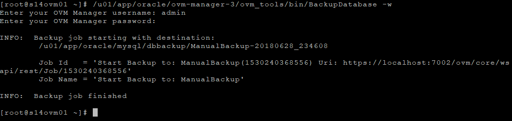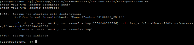 Nós também podemos gerar um backup manual utilizando o utilitário BackupDatabase que se encontra no diretório /u01/app/oracle/ovm-manager-3/ovm_tools/bin/, será solicitado o login e senha do Manager, depois disso um backup é gerado dentro do mesmo diretório dos backups automáticos.