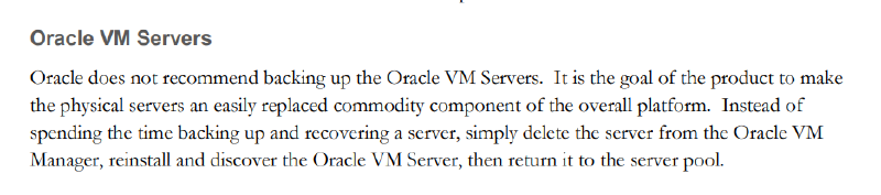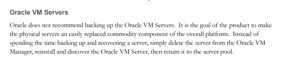 Para começarmos a própria Oracle não recomenda o backup dos servidores Oracle VM, como ela mesmo diz: simplesmente exclua o servidor do Oracle VM Manager, reinstale e descubra o Oracle VM Server.