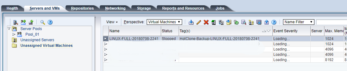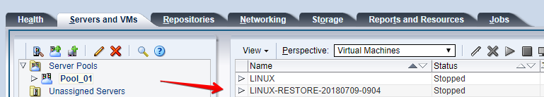 Será criada uma máquina virtual em Unassigned Virtual Machines com o mesmo nome do backup.