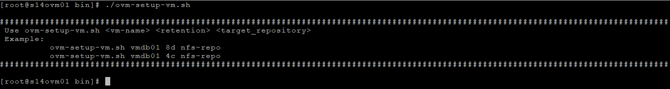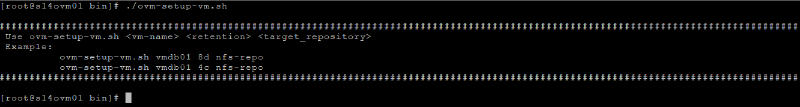 # ./ovm-setup-vm.shEntão, no meu ambiente tenho uma máquina virtual com o nome LINUX, desejo manter uma retenção dos últimos 4 backups e salvar ela no repositório Backup, executamos o comandos passando os seguintes parâmetros: