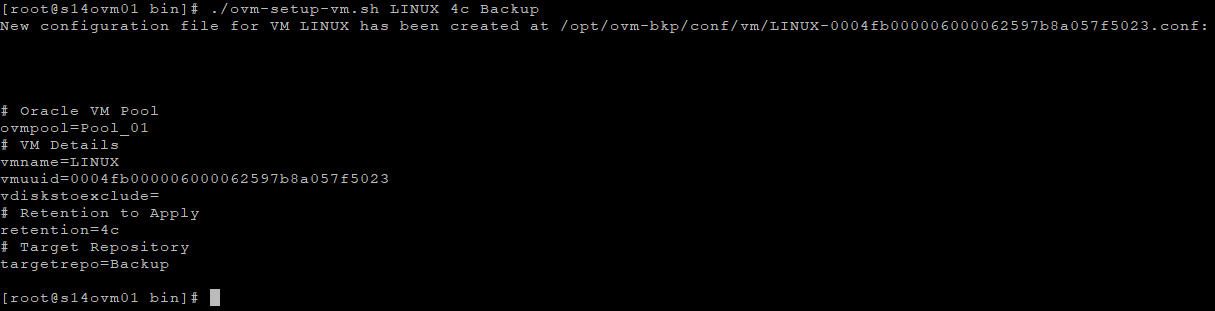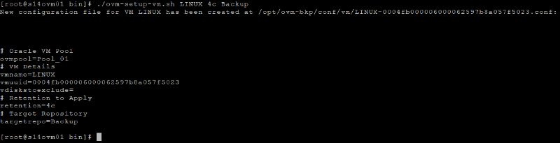 ./ovm-setup-vm.sh LINUX 4c BackupO arquivo LINUX-0004fb000006000062597b8a057f5023.conf foi criado no diretório /opt/ovm-bkp/conf/vm/ com os parâmetros especificados, como mostra a imagem abaixo: