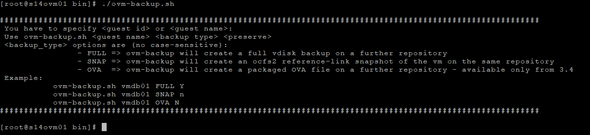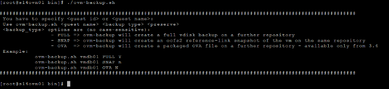 # ./ovm-backup.sh LINUX full nOBS: Os parâmetros do script não são case sensitives, ou seja, tanto faz serem digitados em maiúsculo ou minúsculo, o nome da máquina virtual deve ser igual ao do ambiente.