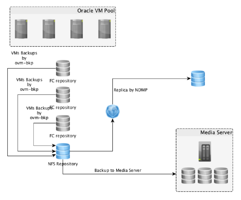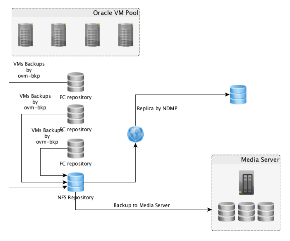 A imagem abaixo ilustra uma arquitetura do ambiente Oracle VM com backup:
