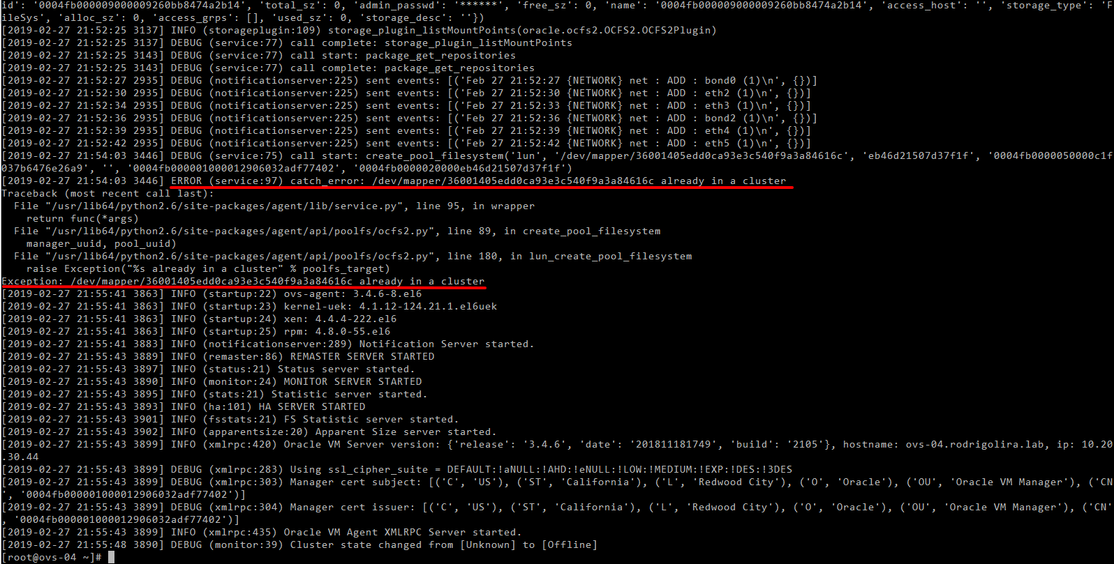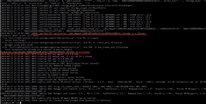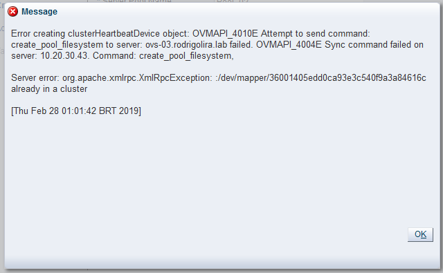 O problema é o seguinte, quando tentamos criar um Pool com um disco que já contenha o sistema de arquivos OCFS2, o Oracle VM Agent no servidor irá detectar o sistema de arquivos OCFS2 e se recusará a substituir o mesmo, esse é o comportamento padrão e é uma forma de proteção contra acidentes, para não acabarmos formatando o disco errado.