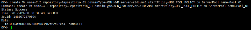 create Vm name=CLI repository=Repositorio_01 domainType=XEN_HVM server=s14ovms1 startPolicy=USE_POOL_POLICY on ServerPool name=Pool_01Vm name=CLI (Nome da VM que estamos criando)