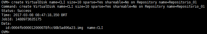 create VirtualDisk name=CLI size=10 sparse=Yes shareable=No on Repository name=Repositorio_01VirtualDisk name=CLI (Cria um disco virtual com o nome CLI)