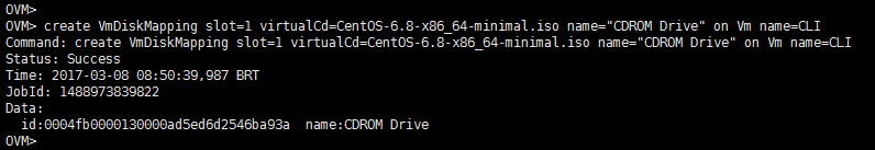 create VmDiskMapping slot=1 virtualCd=CentOS-6.8-x86_64-minimal.iso name="CDROM Drive" on Vm name=CLIObs: O arquivo CentOS-6.8-x86_64-minimal.iso já foi importado anteriormente para dentro do ambiente.
