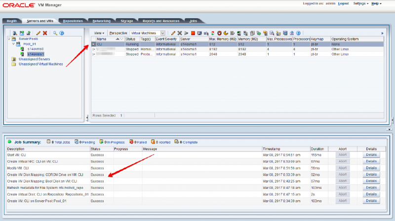 start Vm name=CLIComo podemos verificar na imagem abaixo, a vm é criada corretamente e todo o processo realizado via CLI é exibido no Job Summary da interface web.