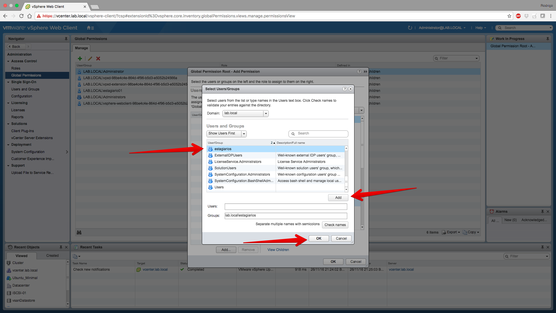 Selecione o grupo estagiarios, clique em Add e depois em OK: