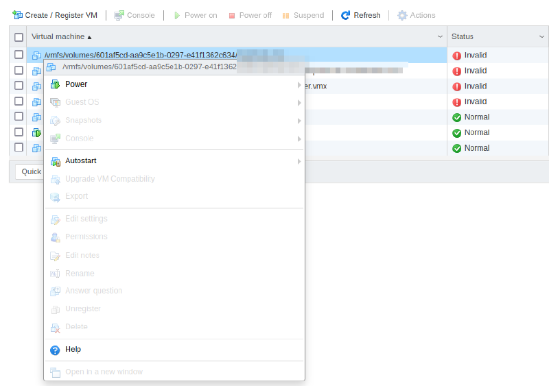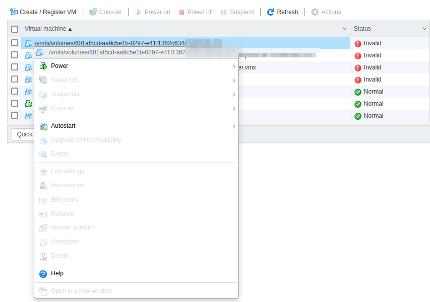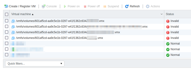 Como ESXi perdeu referência com essas máquinas virtuais ficou apresentando um Status de Invalid para essas máquinas virtuais.