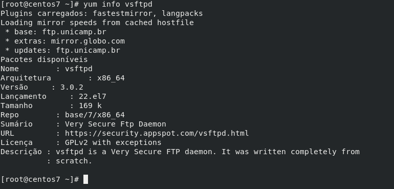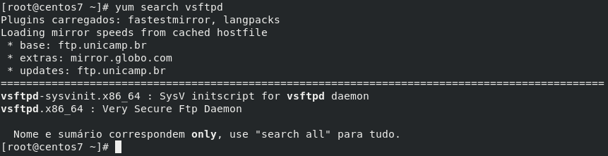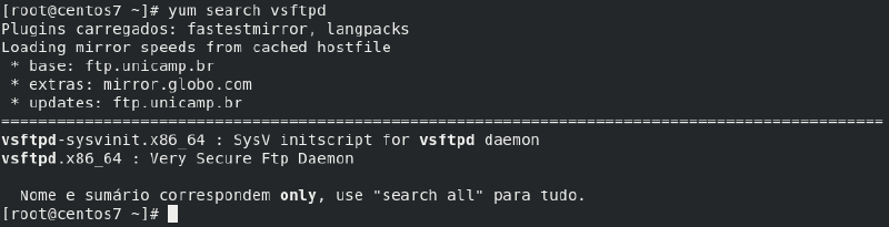 # yum search vsftpd (vsftpd é o pacote pesquisado)O resultado da pesquisa mostra todos os pacotes que façam referência ao vsftpd.