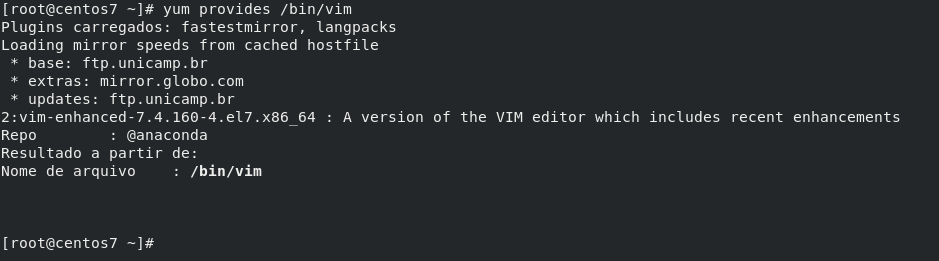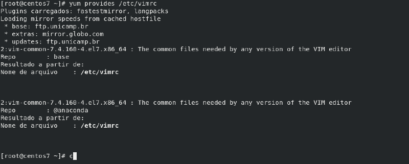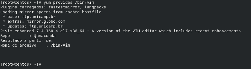 # yum provides /bin/vim# yum provides /etc/vimrcPara listar todos os pacotes instalados no sistema, executamos o seguinte comando: