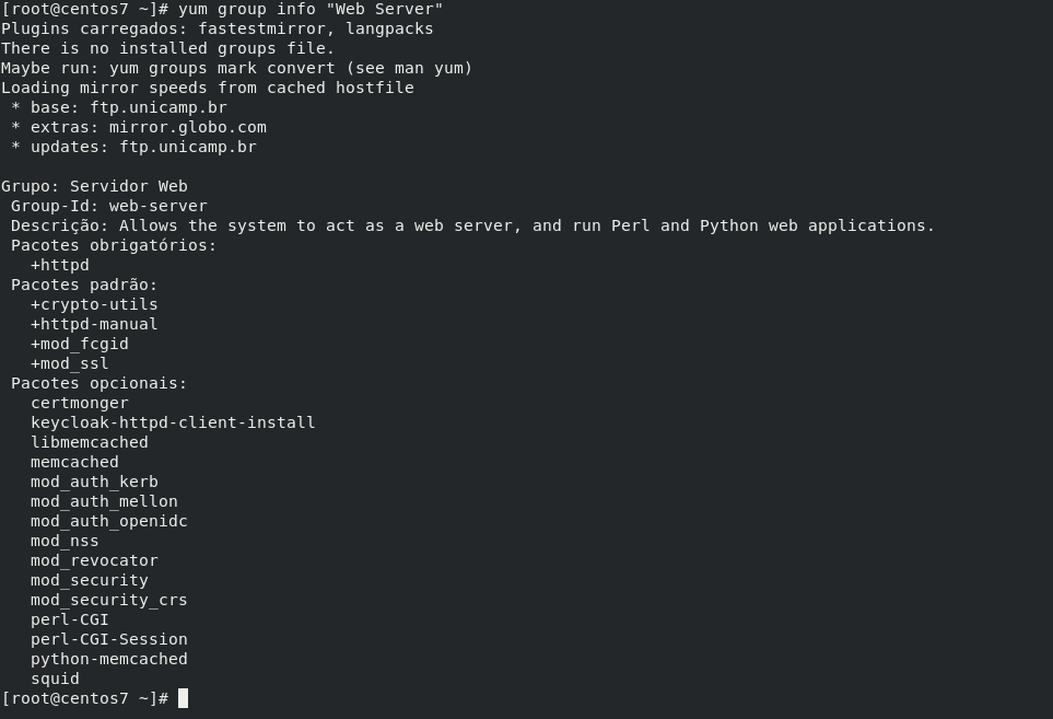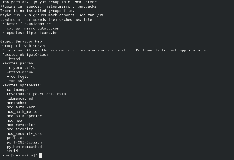 # yum group info "Web Server" (Web Server é o nome do grupo)