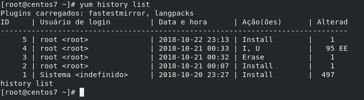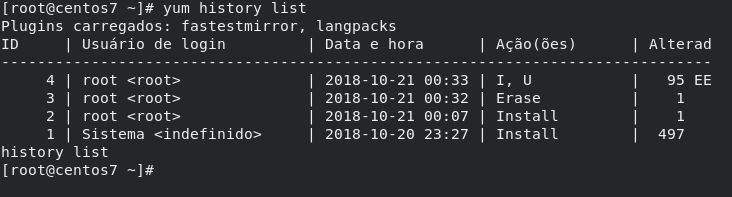 Para começar vamos executar o comando abaixo, ele irá listar tudo que foi realizado pelo yum: