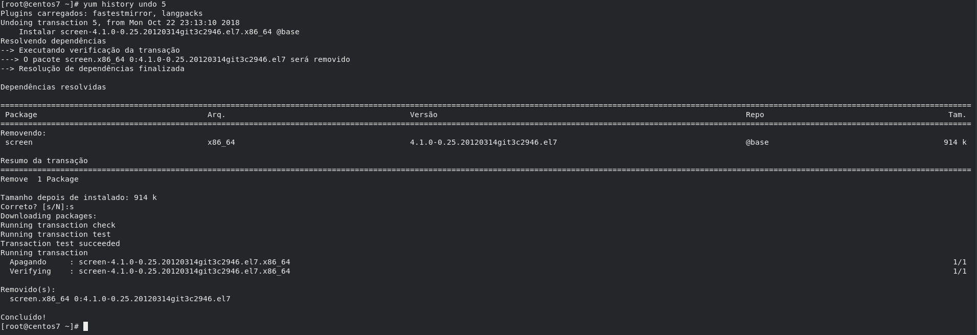 Agora que já sabemos o que foi realizado no sistema, podemos desfazer o que foi realizado apenas passando a opção undo ID.
