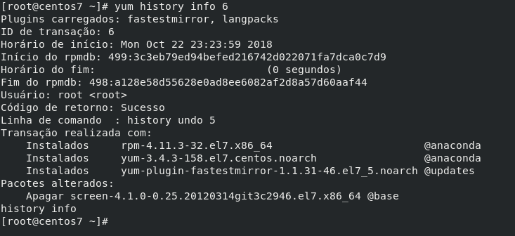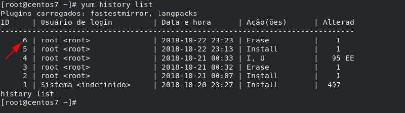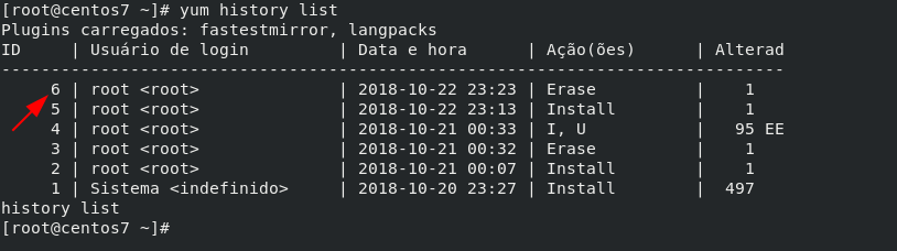 Se executarmos mais uma vez o “yum history list”, veremos que temos mais um ID (6), que foi gerado devido ao nosso último comando.