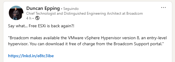 Hoje, navegando pelo LinkedIn, me deparei com uma postagem interessante de Duncan Epping, renomado engenheiro da VMware, que atualmente faz parte da Broadcom. Na publicação, ele menciona a volta da versão gratuita do ESXi, algo que muitos profissionais de TI vinham aguardando ansiosamente desde as recentes mudanças na estratégia de licenciamento.