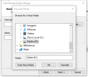 No meu caso, tenho um segundo disco no notebook, chamado Dados, vamos compartilhar ele, selecione o disco ou a pasta e clique em OK.