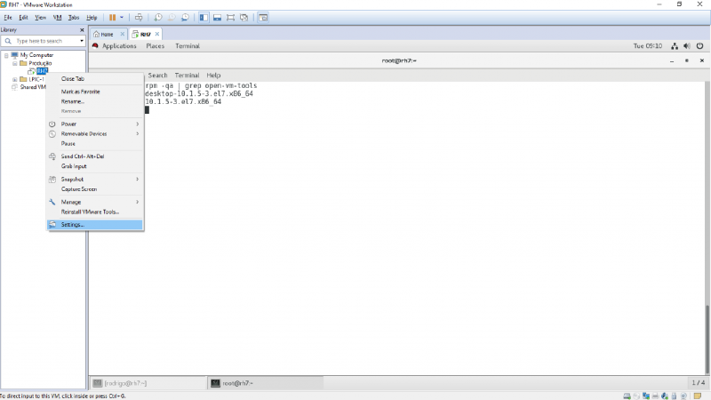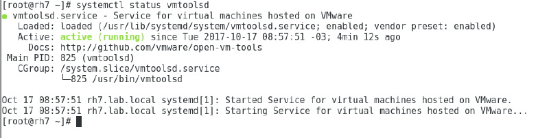 Em uma instalação padrão do Red Hat 7, o pacote open-vm-tools já vem instalado por padrão, verifique se o mesmo está em execução com o comando abaixo: