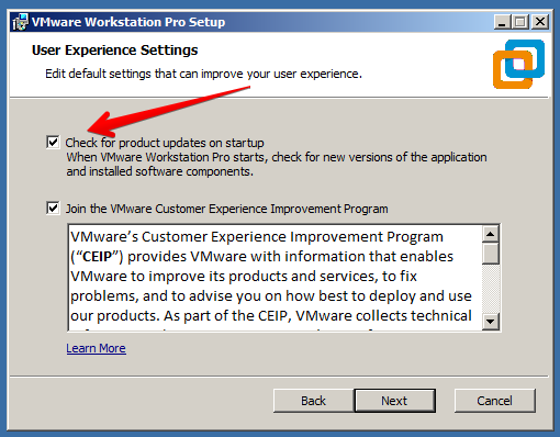 Check for product updates on startup - verifica por atualizações ao iniciar o VMware Workstation Pro 15.