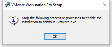 Se o VMware Workstation Pro 15 ainda estiver em execução a seguinte mensagem pode ser exibida.