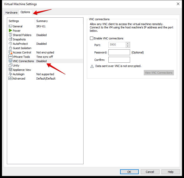 1 - Acesse as configurações da máquina virtual e vá para Options > VNC Connections, se você não sabe chegar nas configurações, leia os outros posts da serie que explico como chegar.