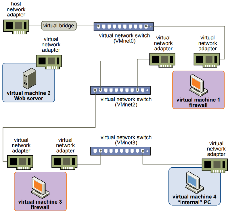 Os switches virtuais realizam a conexão entre as máquinas virtuais e sua respectiva redes virtual, esses switches seguem o seguinte padrão de nomeclatura VMnet0, VMnet1, VMnet2 e assim por diante.