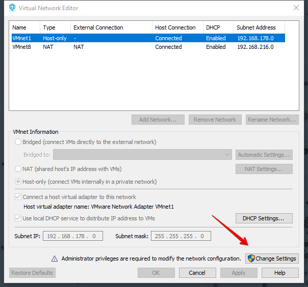 Para realizarmos as modificações desejadas no ambiente precisamos executar o Virtual Network Editor como usuário administrador/root ou apenas clicar em Change Settings para mudar as permissões, o programa será fechado e se abrirá novamente.