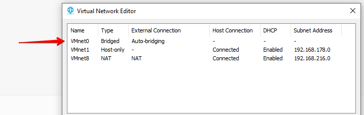 Por padrão a VMnet0 é configurada como Bridged e não temos um servidor DHCP Virtual habilitado nessa rede.