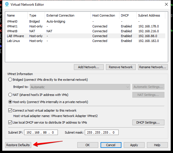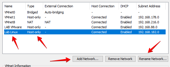Também podemos adicionar novas redes, essas novas redes só podem ser do tipo Host-only, podemos renomear essas novas redes, as redes Defaults (VMnet0, VMnet1 e VMnet8 não podem ser renomeadas.