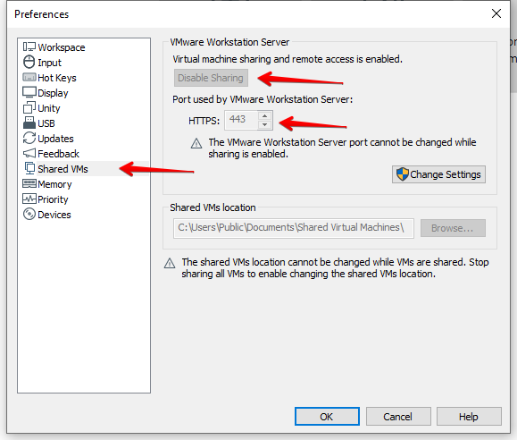Agora vá em Shared VMs, se estiver desabilitado habilite, a porta padrão é a 443, e caso deseje pode mudar as pasta padrão onde as máquinas virtuais compartilhadas são alocadas.
