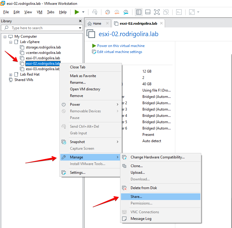 A outra possibilidade é que podemos compartilhar uma máquina virtual já criada, para isso clique na máquina virtual com o botão direito do mouse, vá em Manage > Share.