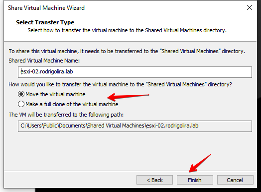 Escolha se você deseja mover a máquina virtual para o diretório de máquinas virtuais compartilhadas ou se deseja clonar essa máquina virtual para o diretório de máquinas virtuais compartilhadas, clique em Finish.