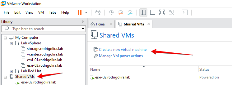 Agora podemos compartilhar nossa máquina virtual, nós temos duas possibilidades, a primeira é criar uma nova máquina virtual já compartilhada, para isso vamos em Shared VMs e depois Create a new virtual machine, os passos de configuração da máquina virtual são os mesmos quando criamos uma máquina virtual não compartilhada.