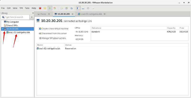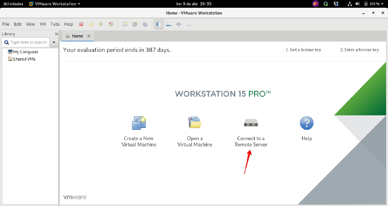 Agora vamos conectar nossa máquina virtual compartilhada remotamente, de outro computador com o VMware Workstation Pro 15 instalado, no meu caso o VMware Workstation Pro 15 está instalado no Fedora 29, clique em Connect to a Remote Server.