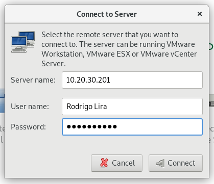 Insira as informações de acesso, o número do endereço IP do host remoto com VMware Workstation Pro 15, usuário e senha.