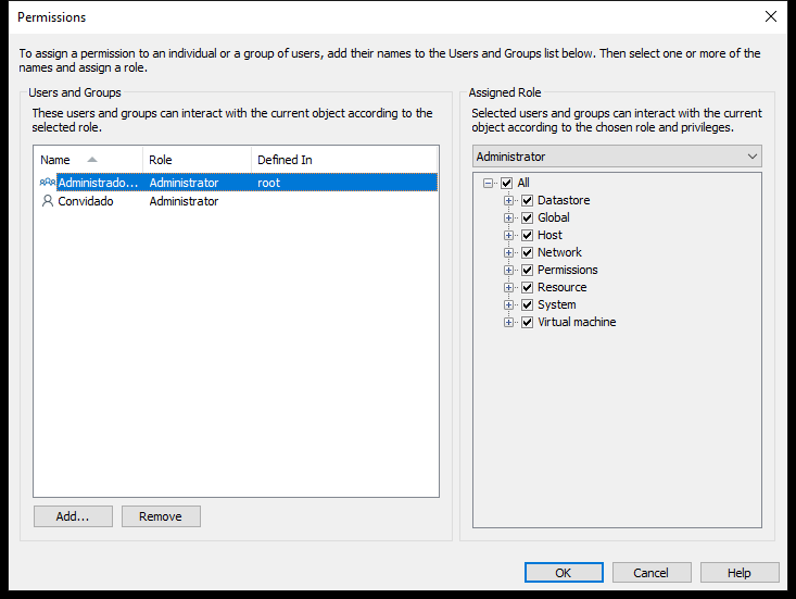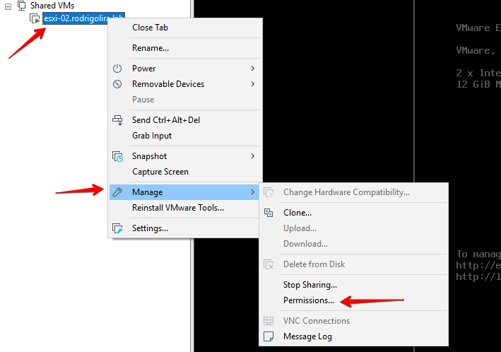 Outra coisa que ganhamos quando trabalhamos com máquinas virtuais compartilhadas, é a possibilidade de darmos permissões especificas para cada usuário que se conectará a ela, para definirmos essas permissões clique com o botão direito do mouse na máquina virtual, Manager > Permissions.