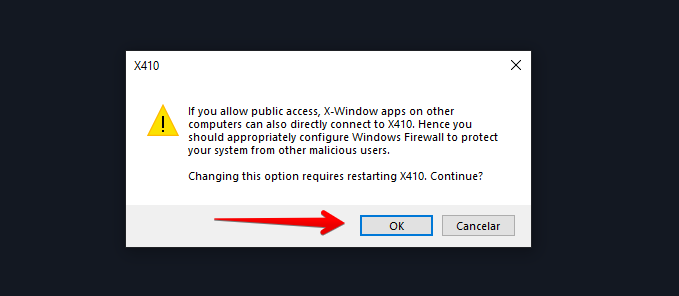 Faça a instalação dele e depois execute o mesmo, um ícone irá aparecer na Área de Notificações, clique nele e depois clique em Allow Public Access para permitir a comunicação do X410 pela rede.