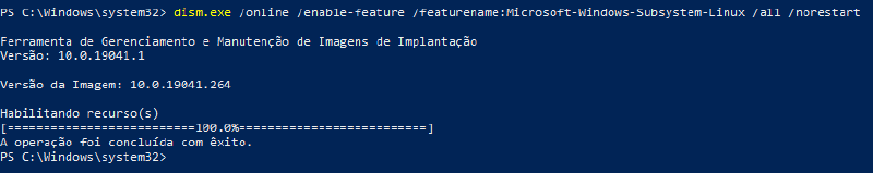dism.exe /online /enable-feature /featurename:Microsoft-Windows-Subsystem-Linux /all /norestartOBS: Por padrão até o momento quando fazemos a instalação do WSL estamos fazendo a instalação da versão 1.