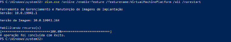 dism.exe /online /enable-feature /featurename:VirtualMachinePlatform /all /norestartReinicie o computador.