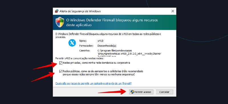 Marque Redes privadas e Redes públicas e clique em Permitir acesso.