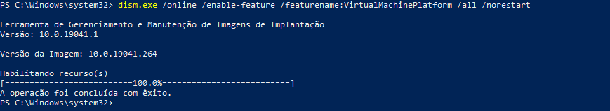 dism.exe /online /enable-feature /featurename:VirtualMachinePlatform /all /norestartReinicie o computador.