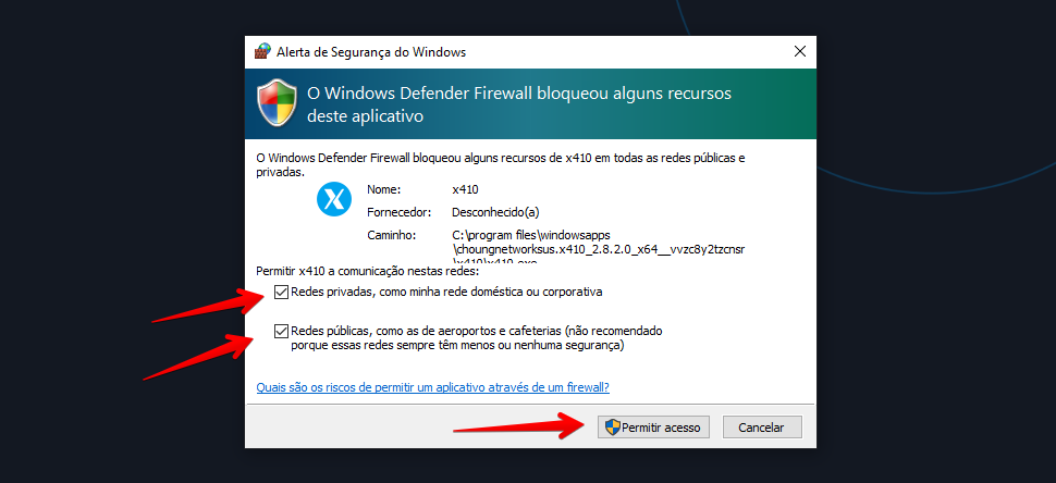 Marque Redes privadas e Redes públicas e clique em Permitir acesso.