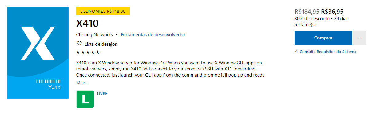 Para podermos executar o ambiente gráfico precisamos de um servidor X Window, nesse caso estou usando o X410 que também está disponível na Microsoft Store.